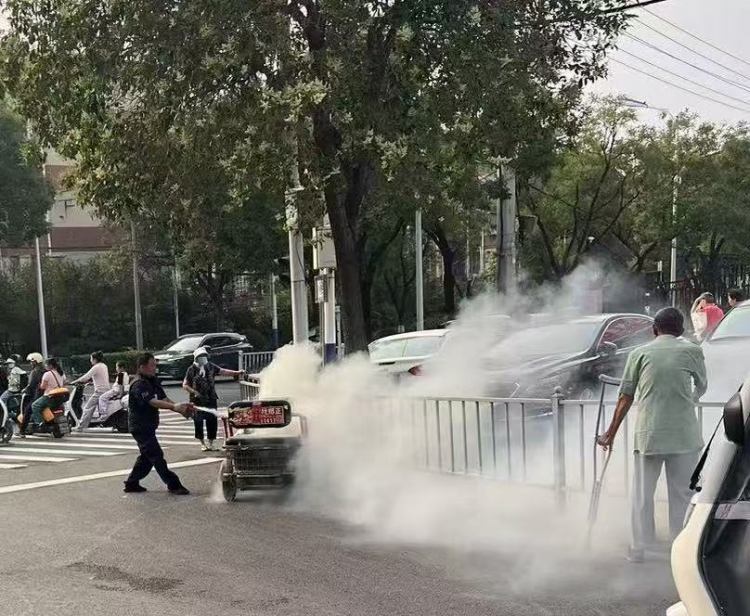 2025年6月11日上午7時41分許,淮北市保安有限公司武裝押運一中隊W699Y車組行駛至建設銀行西城支行網(wǎng)點路口時,突遇一輛三輪電動車自燃,火苗從車底迅猛竄出,騎車老人驚慌失措,周邊群眾紛紛后退。時值早高峰,車流人流密集,如不及時處置,后果不堪設想。